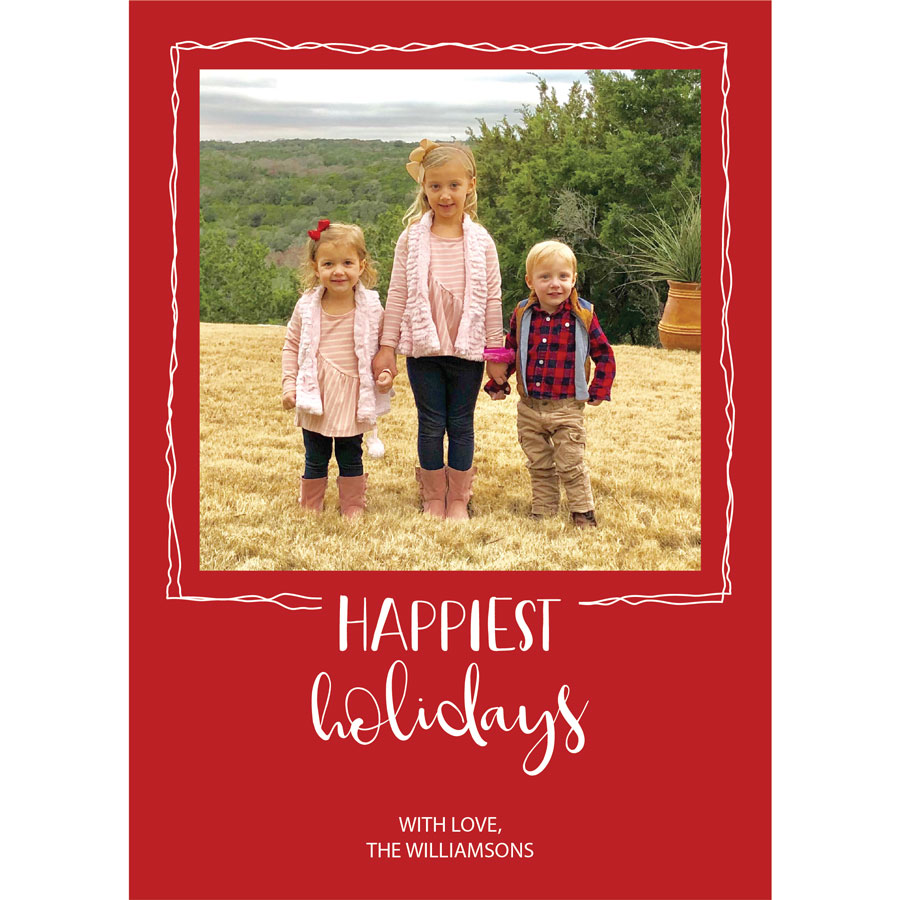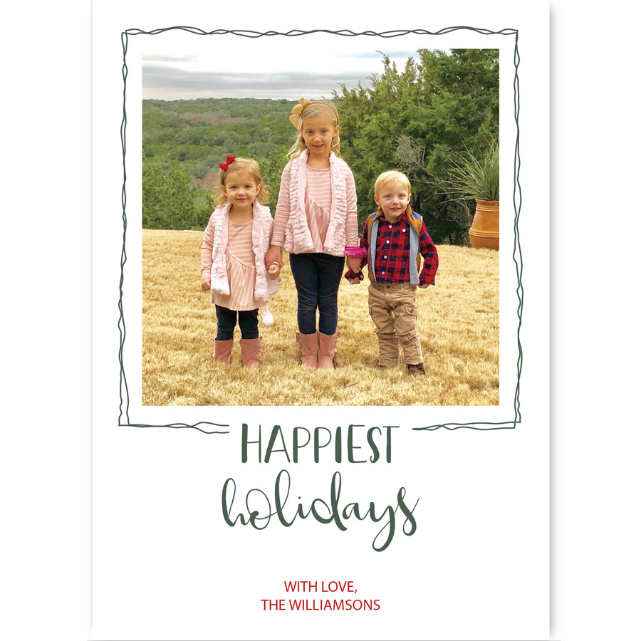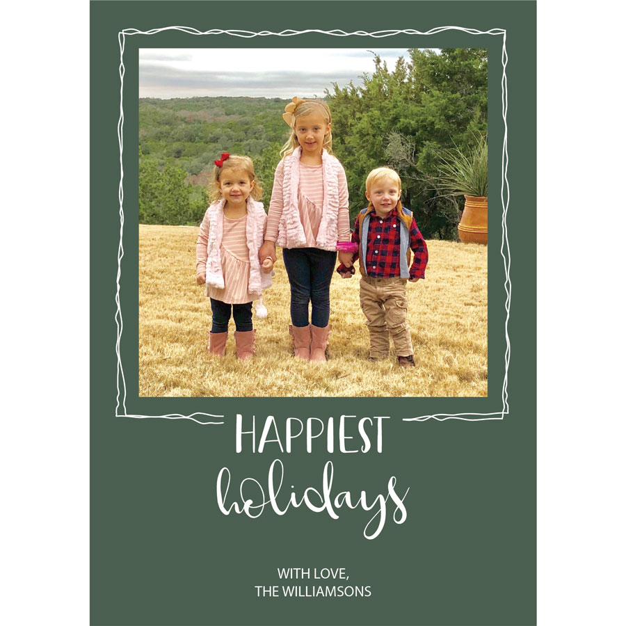 • Provide the custom holiday message you would like included (through the form we’ve provided) to customize the Framed Happiest Holidays Holiday Photo Card