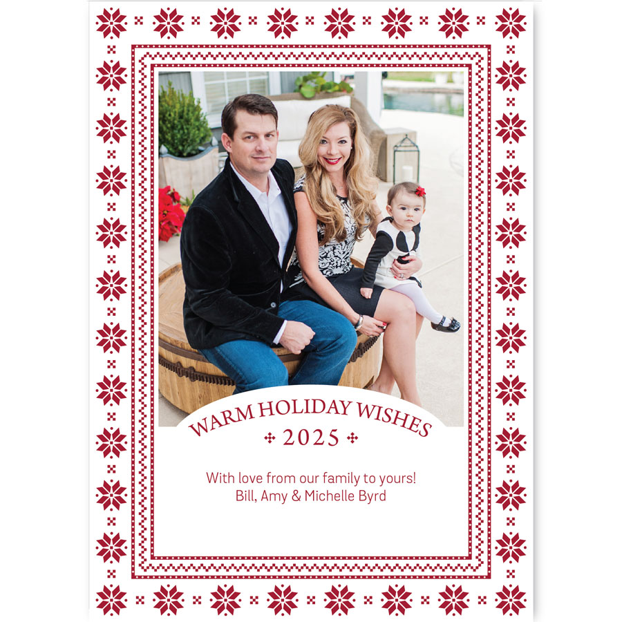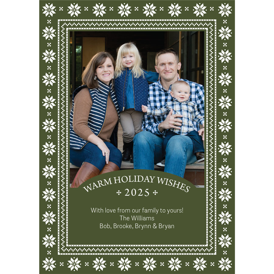 - Provide the custom holiday message you would like included (through the form we’ve provided) to customize the Warm Holiday Wishes Holiday Photo Card